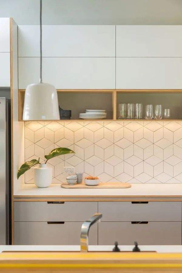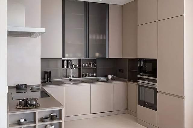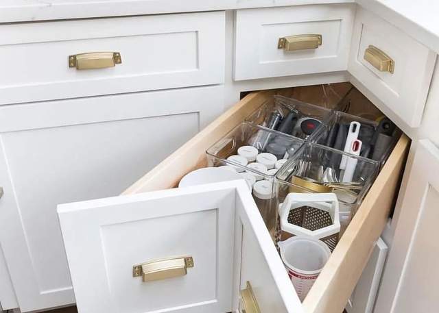 这时,可以将橱柜转角的地方做成转角拉篮,拉伸式的收纳设计使得拐角最里面也能够得着,还能减少柜门开合的拥挤与不便;或者直接将台面的直角设计成多边形,不仅可以增加台面面积,还可以多一些收纳空间。