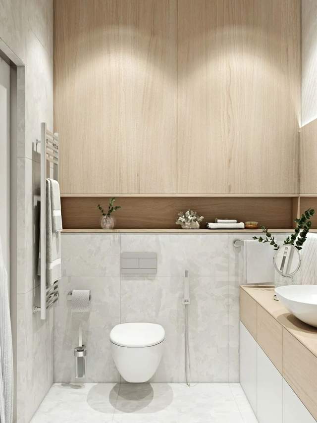 如果马桶和洗手台相邻,还可以定制一个大镜柜,不仅大气,而且连成一片整体感很好,也方便使用。