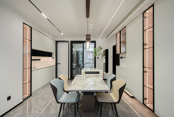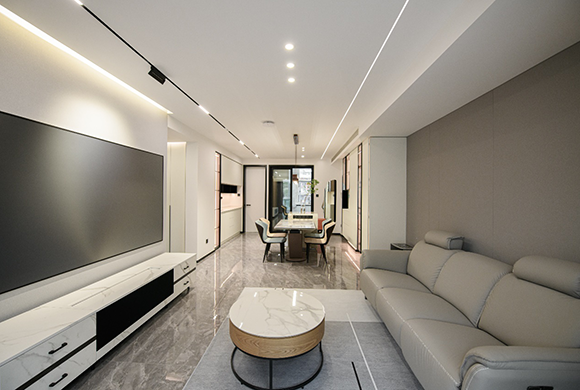 客厅做灰色瓷砖设计,屋顶平面吊顶搭配无主灯设计更凸显空间开阔。主墙面做灰色护板强搭配同色系的沙发,简洁又舒适,电视机则是以白色做打底,将电视机嵌入墙面,下侧增加白色台面的橱柜,扩大收纳空间。
