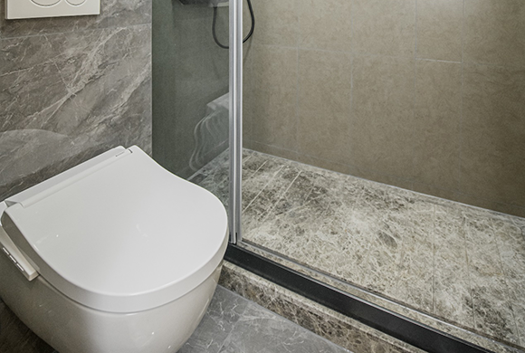 卫生间做干湿分离设计,因为是用水比较多的区域,所以设计师全空间都做大理石与瓷砖设计,防水性更好。悬空智能马桶使用更加方便,淋浴间马桶利用玻璃门隔开,另在淋浴间还设立了小窗台,通透性更好。
