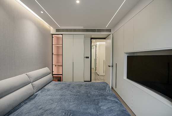 主卧做简洁设计,原木拼成的地面温馨又舒适,平面吊顶增加线条做灯饰,无主灯的设计更加凸显空间的视觉感,墙面双侧分别做墙纸与收纳柜设计,隐藏式设计更加美观,搭配灰色墙体设计,简洁的舒适感扑面而来。