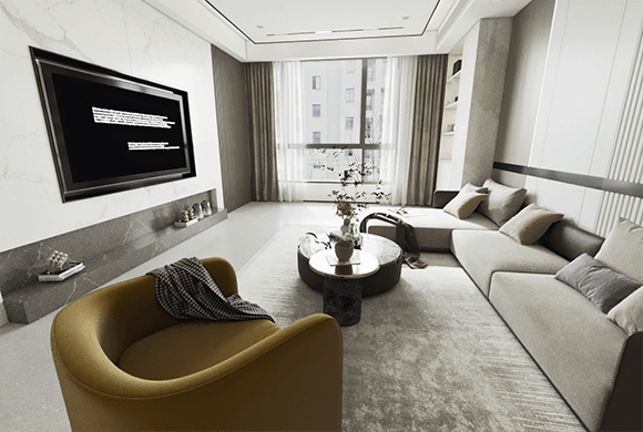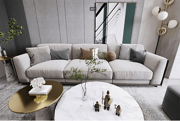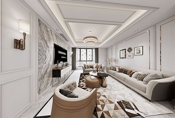 以现代风格为主导,石材和金属元素穿插其中,隐藏在吊顶里的灯带透出柔和明亮的光线,让空间看起来更雅致、更有立体感。再选用极具艺术感的落地灯、台灯、吊灯等多种光源组合搭配,轻松打造出温馨浪漫又充满高级感的居家氛围。
